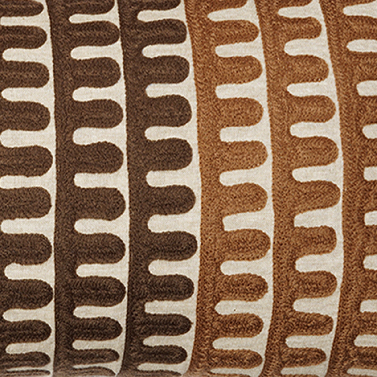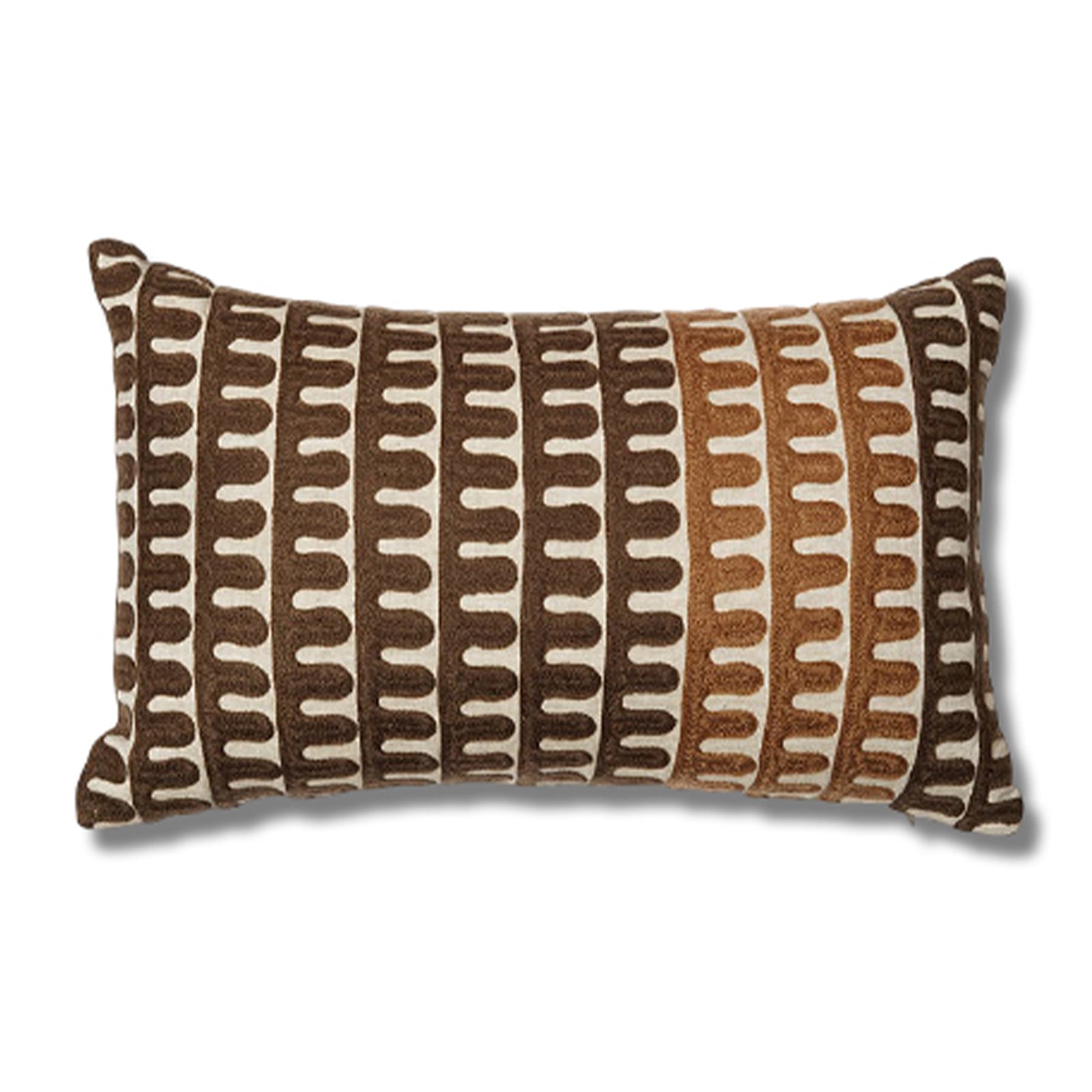 This rectangular cushion stands out with a rhythmic pattern of embroidered lines and curves, rendered in rich brown, soft beige, and deep rust. The visual balance it offers is calming yet artistic, making it perfect for modern homes with a love for handcrafted detail and earth-toned aesthetics.